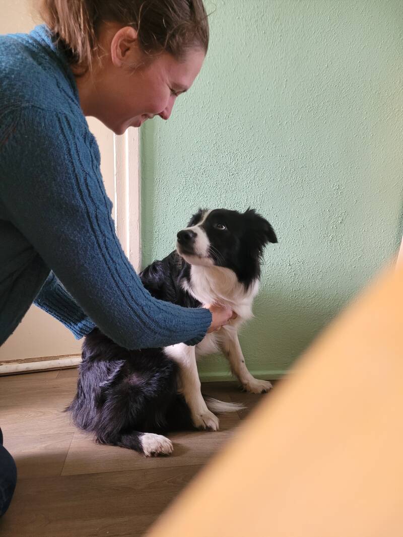 Een hand op de borst of riem recht omhoog en de andere hand op de kont. Door de riem recht omhoog te doen kan hij geen kant op en leert hij dat druk op de riem het commando ‘zit’ betekent.
